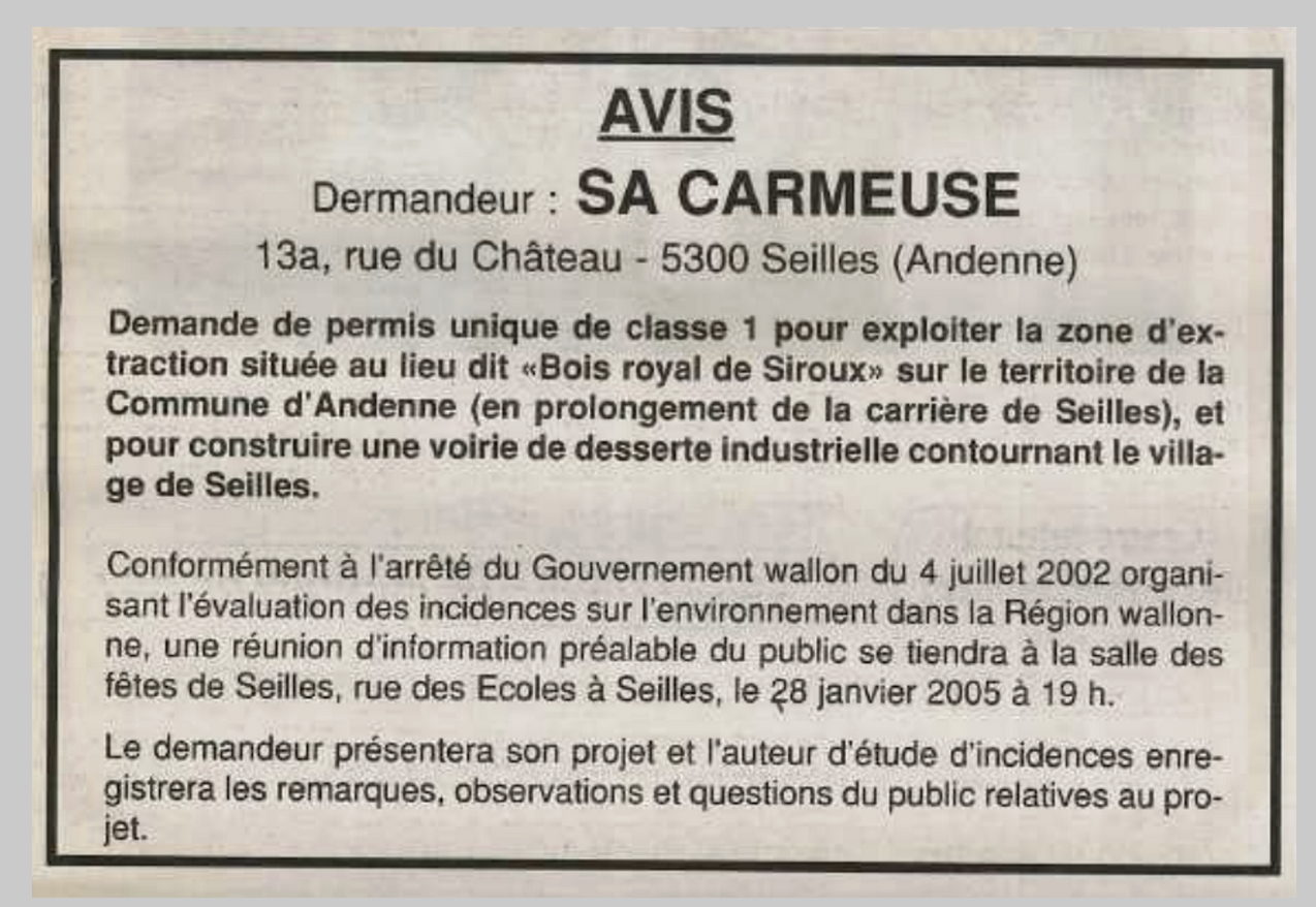 L'enquête publique relative au permis unique introduit par la société CARMEUSE pour l'exploitation d'un gisement calcaire au lieu-dit Bois de Siroux débute le 14 juin et se clôture le 14 juillet 2005.