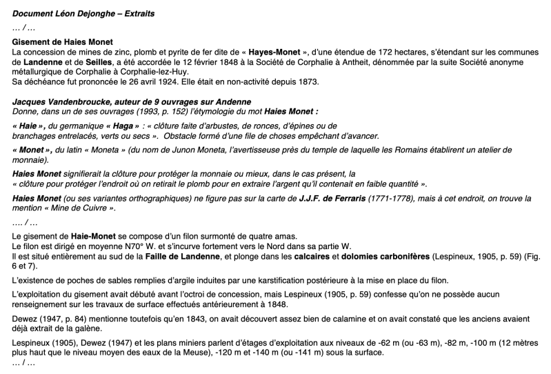 Aux pages 59 à 63 de sa publication de 1905, Georges Lespineux décrit les gisements de Haies Monet et du Roua.